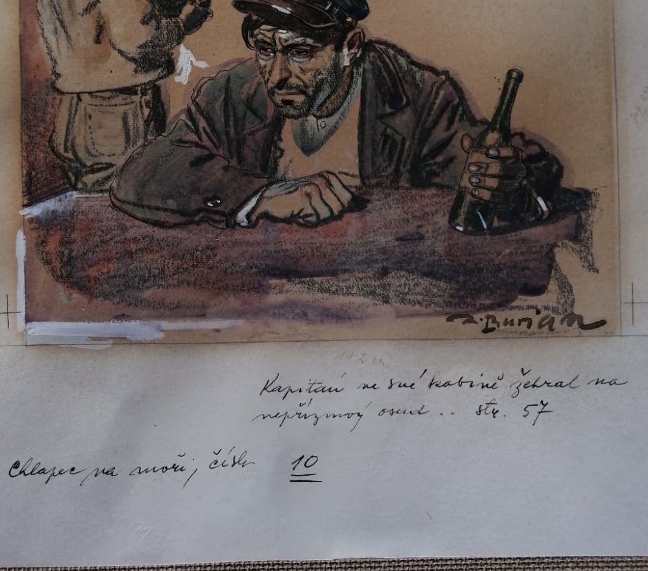 barevná ilustrace č. 10 ke knize Chlapec na moři od Jacka Londona: " Kapitán žehral na nepříznivý osud ", str. 57