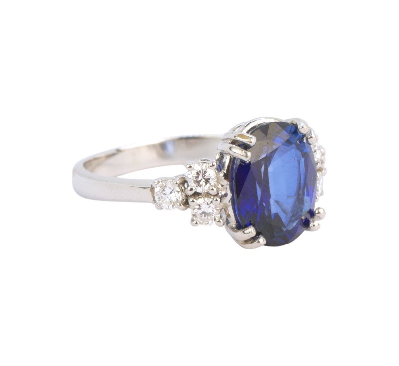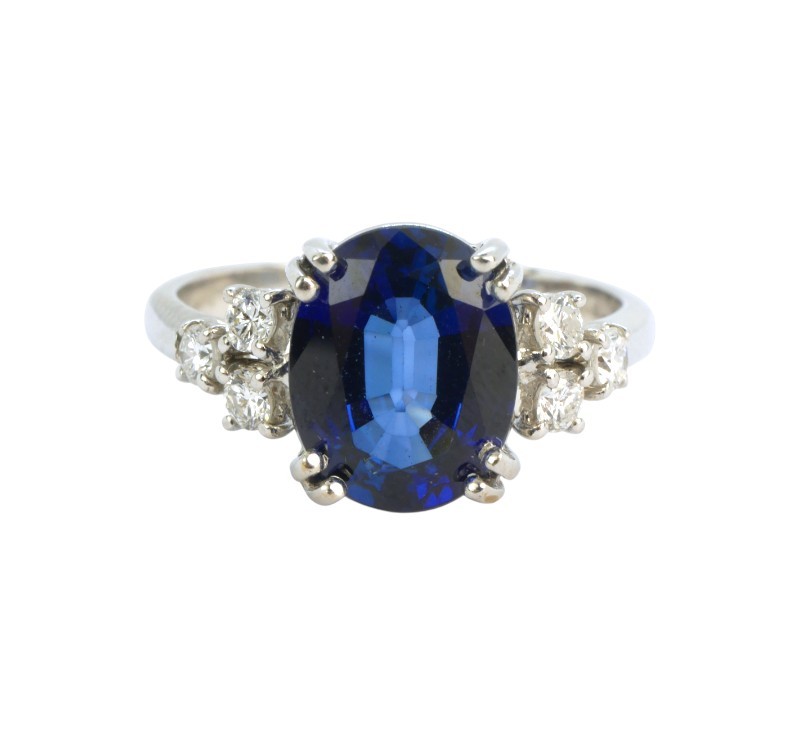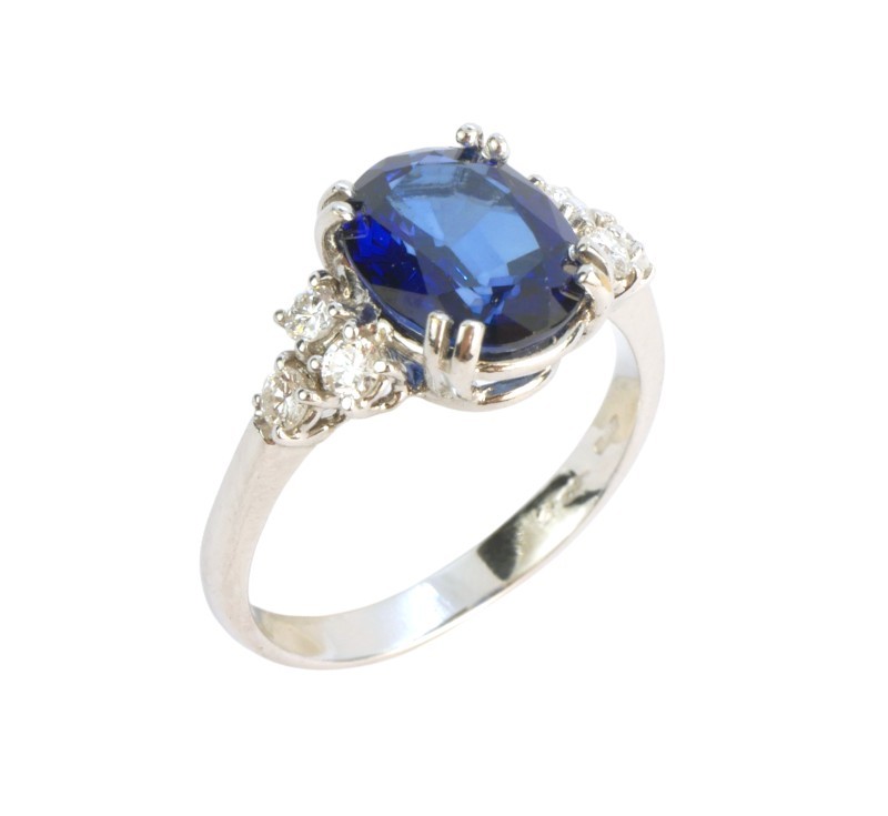 Zlatý prsten s přírodními diamanty briliantového brusu a syntetickým safírem,