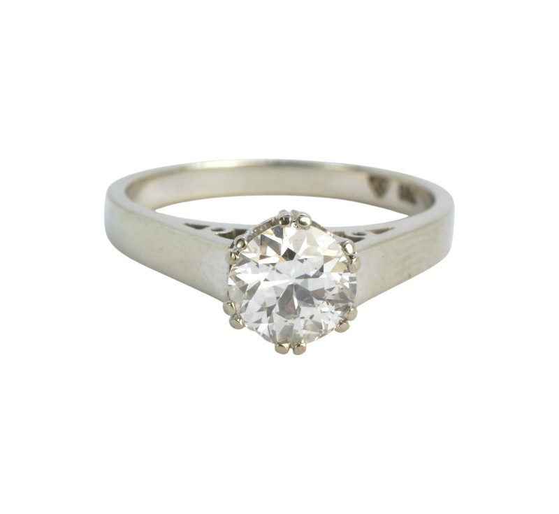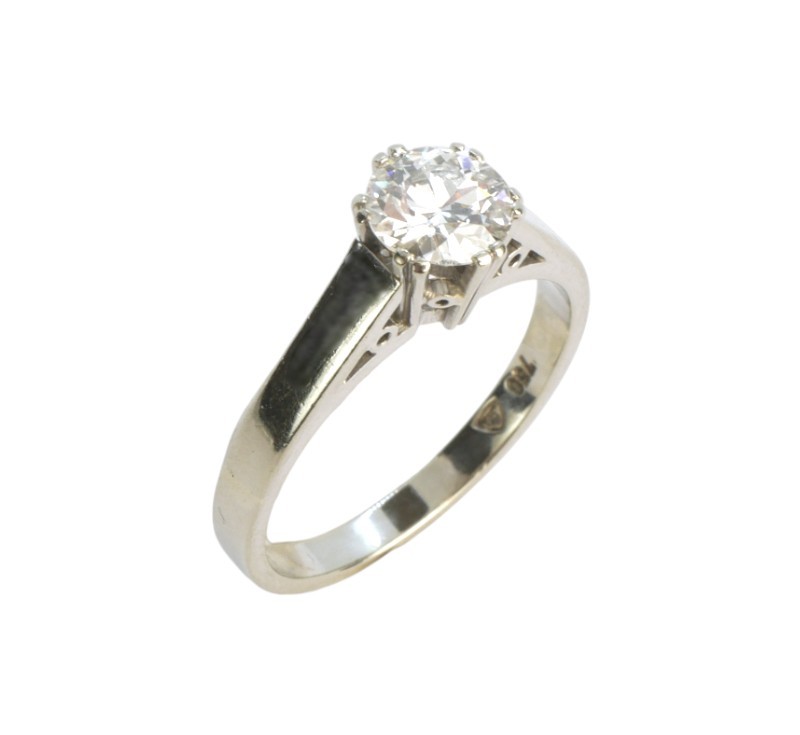 Prsten z bílého zlata je osazený velmi kvalitním solitérním přírodním diamantem kulatého briliantového brusu 0,77 ct