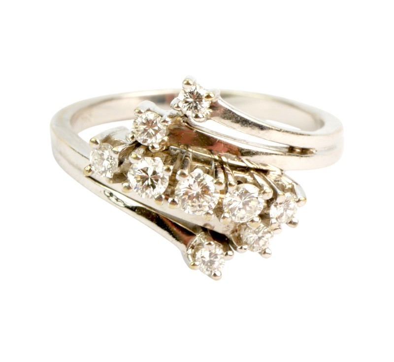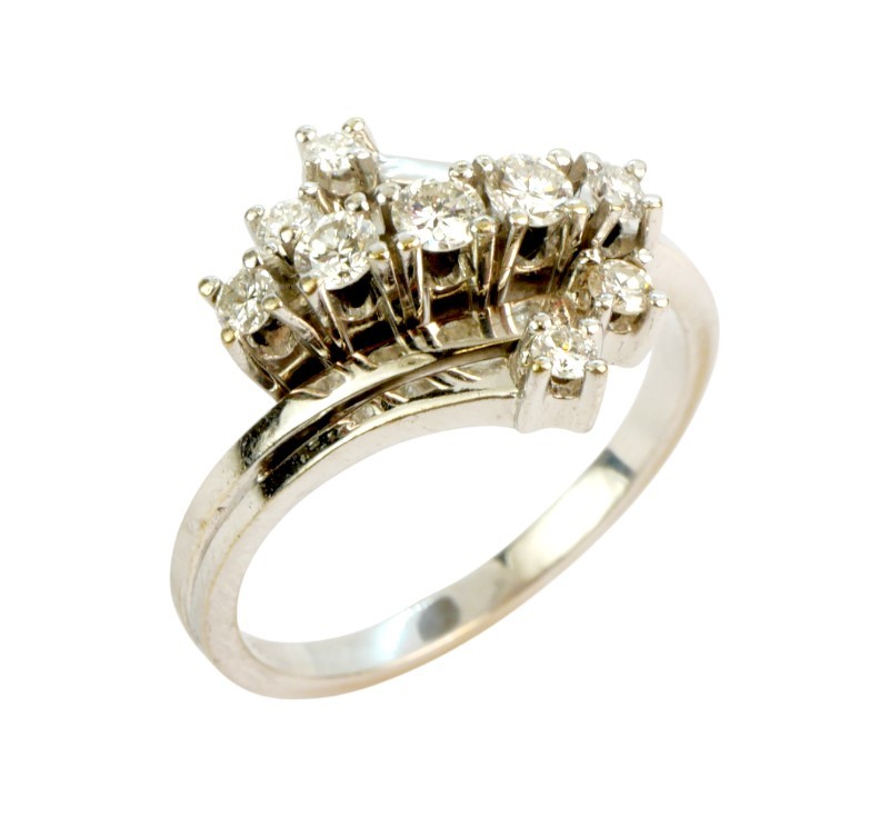 Moderní prsten z bílého zlata je osazený přírodními diamanty briliantového brusu o celkové hmotnosti 0,58 ct,