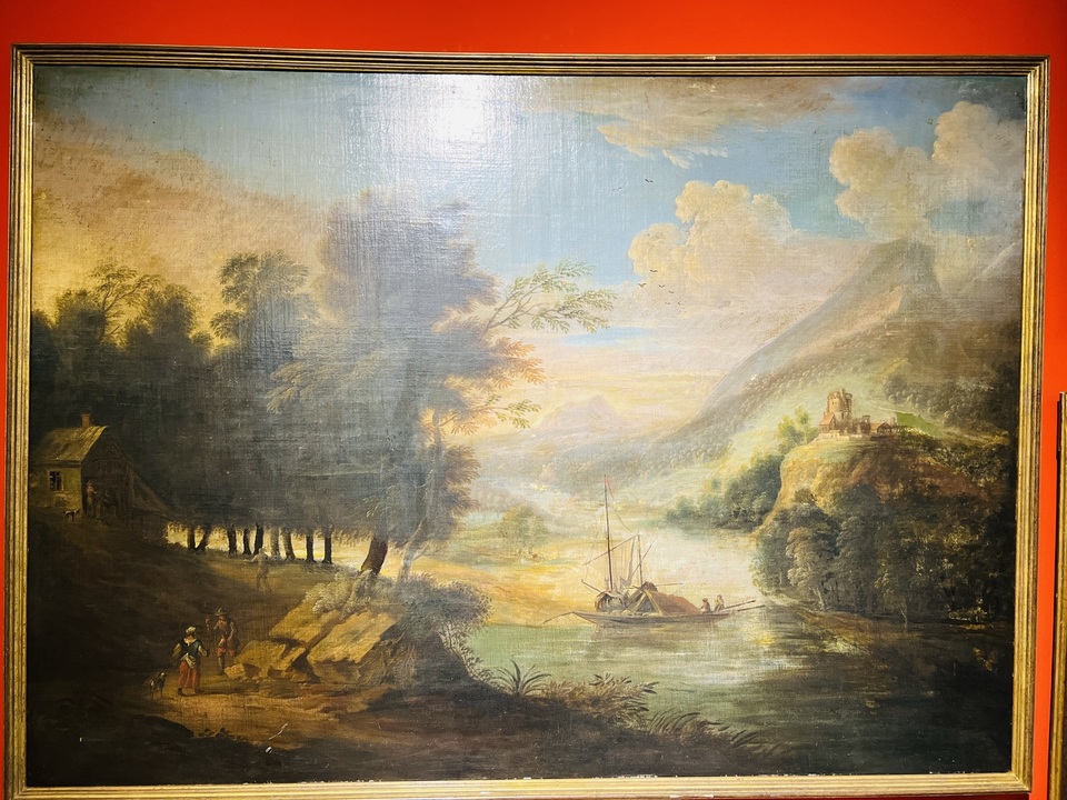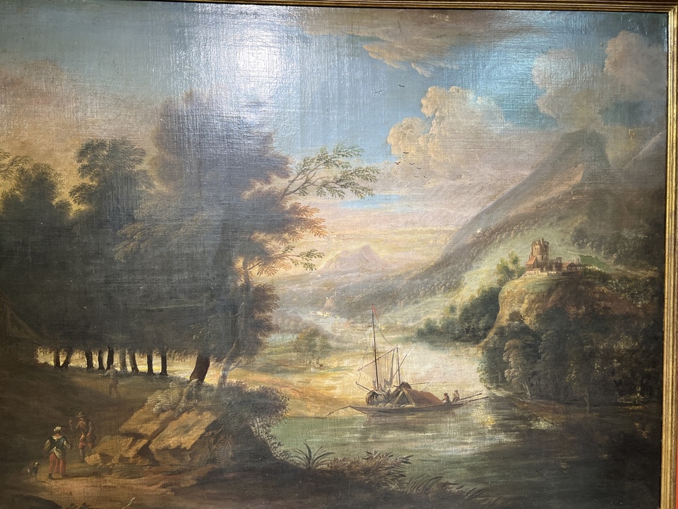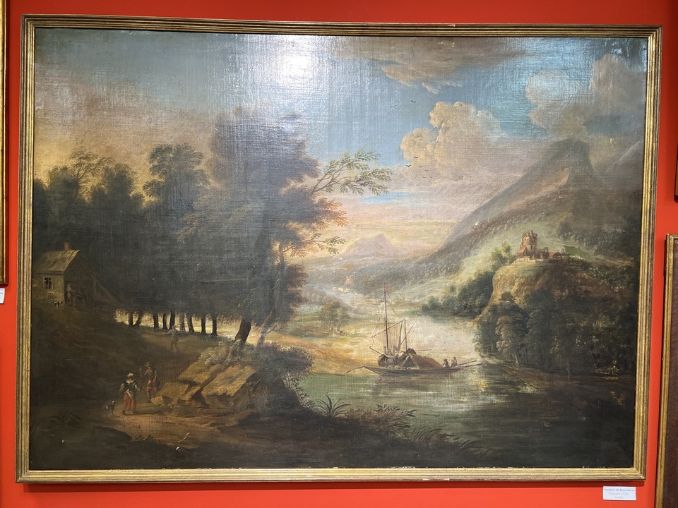 tento monumentální obraz z dílny holandského malíře Frederica de Moucherona (1633-1686) představuje klasickou říční krajinu s jemnou atmosférou světla a stínu. Umělec byl známý svými krajinami, které propisují realistickou detailnost s dekorativní harmonií - charakteristickým rysem nizozemské malby 17. století.