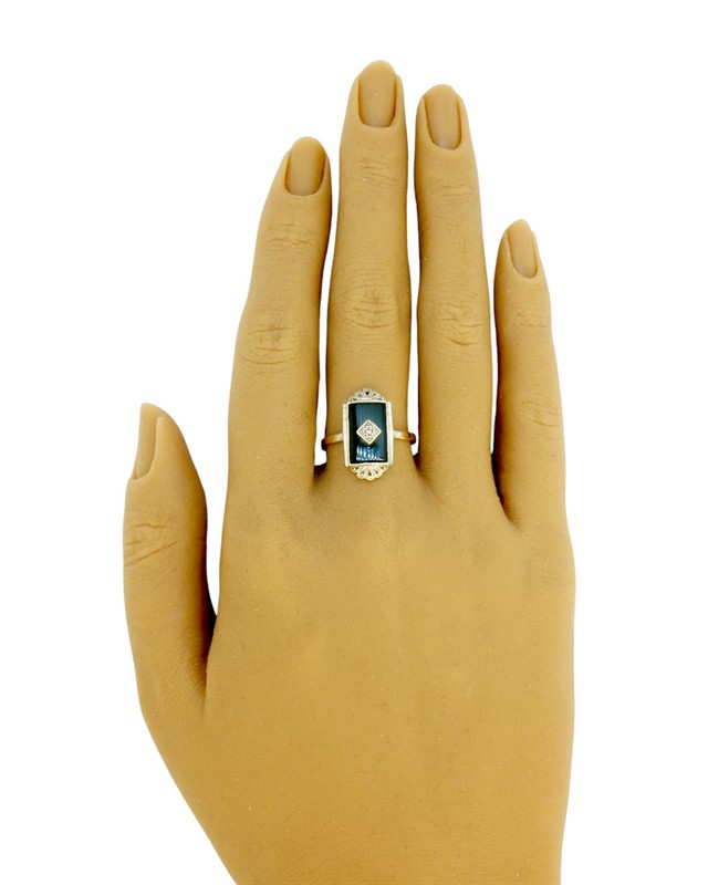 Starožitný zlatý prsten s onyxem a přírodním diamantem starého briliantového brusu 0,02,