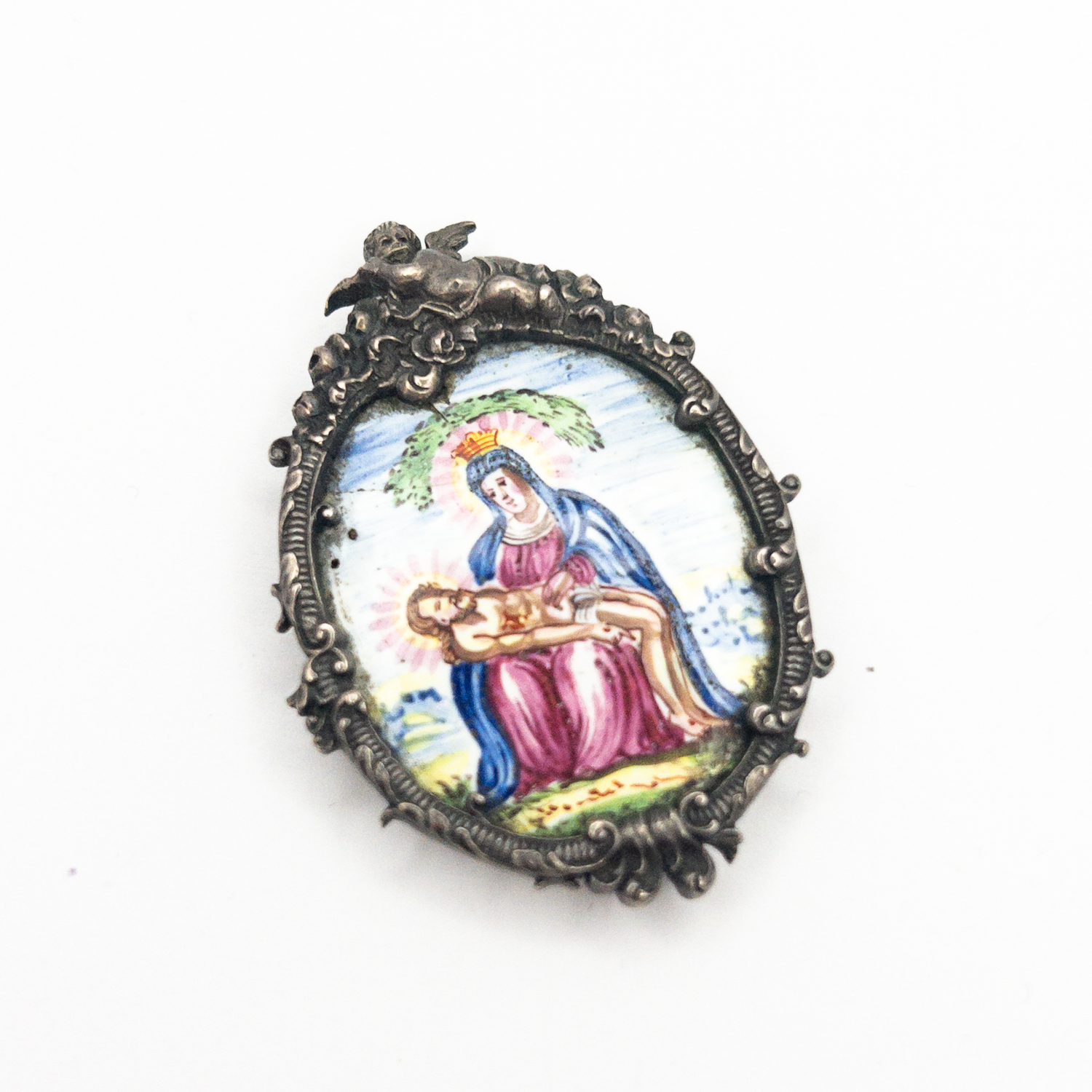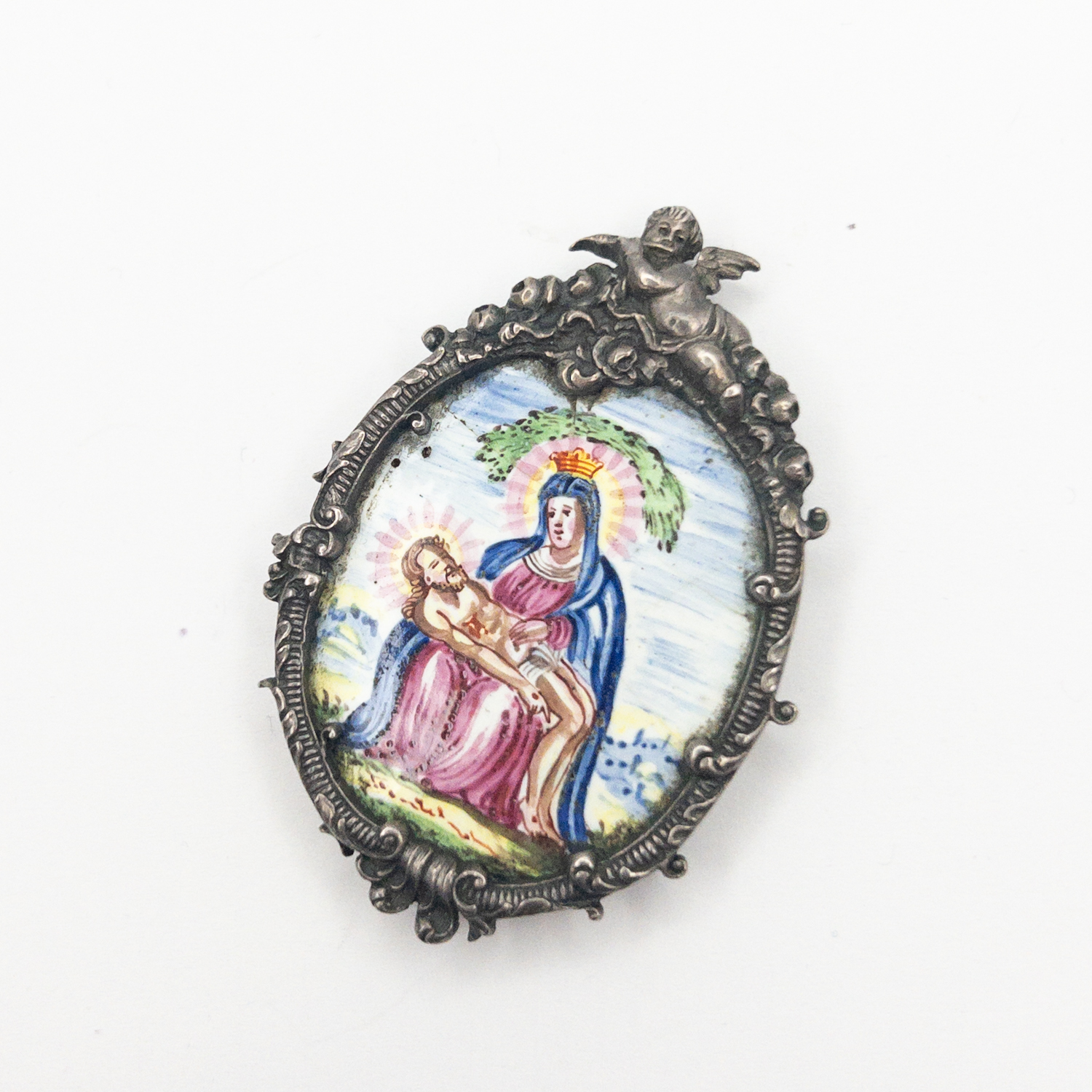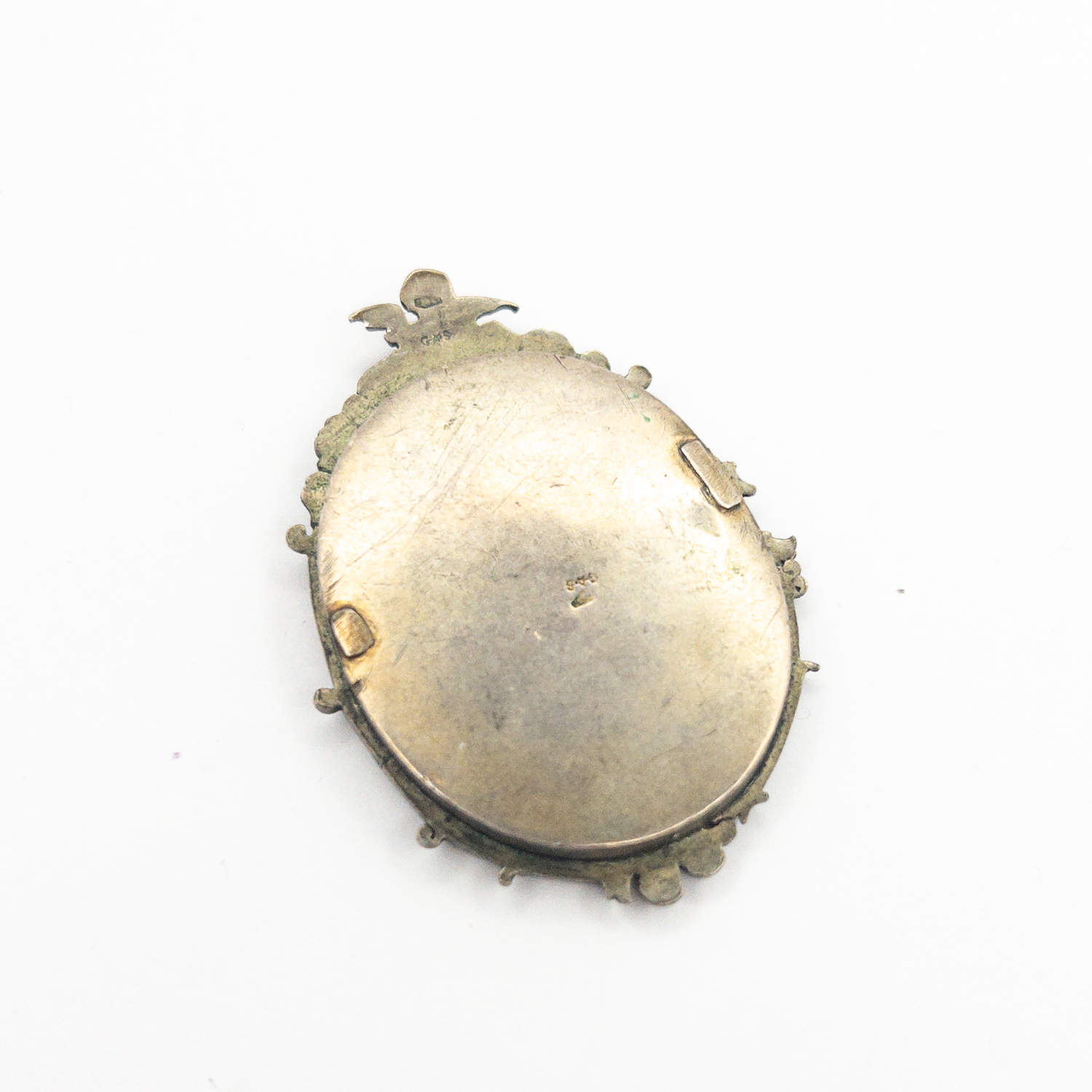 Starožitná ručně malovaná malovaná miniatura na porcelánu, která je zasazena do oválného stříbrného rámečku,