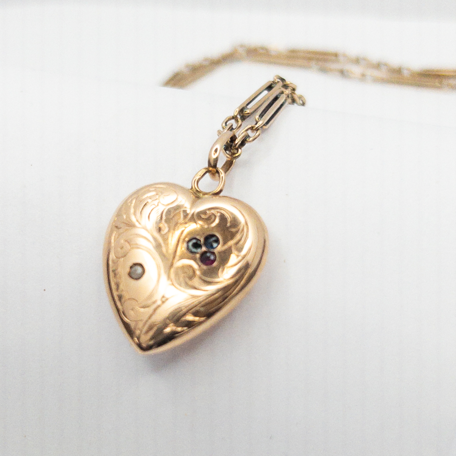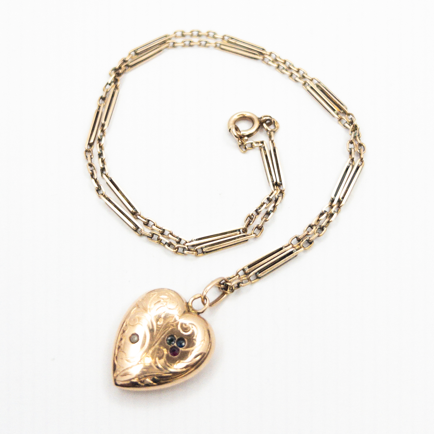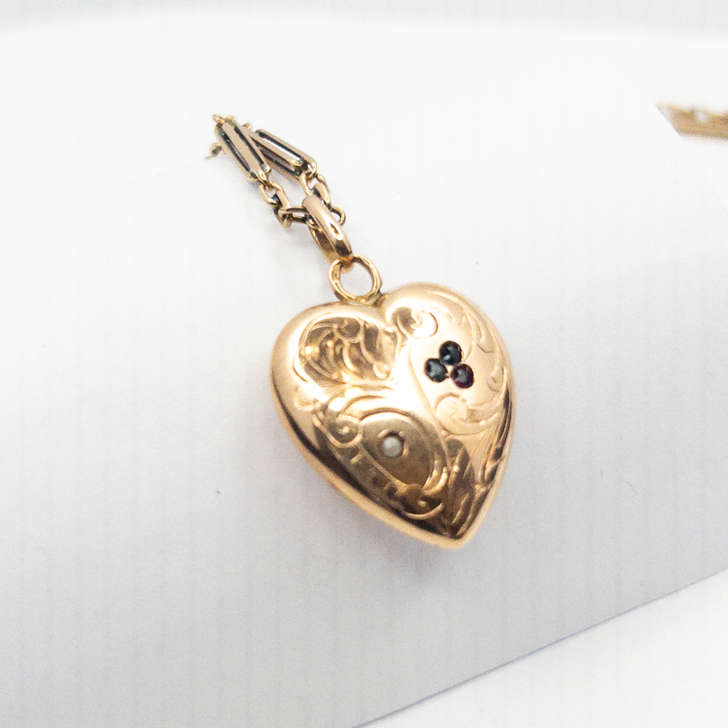 Starožitný zlatý náhrdelník se srdíčkem s perličkou, safírem a granátem, Rakousko - Uhersko, 19. století ,