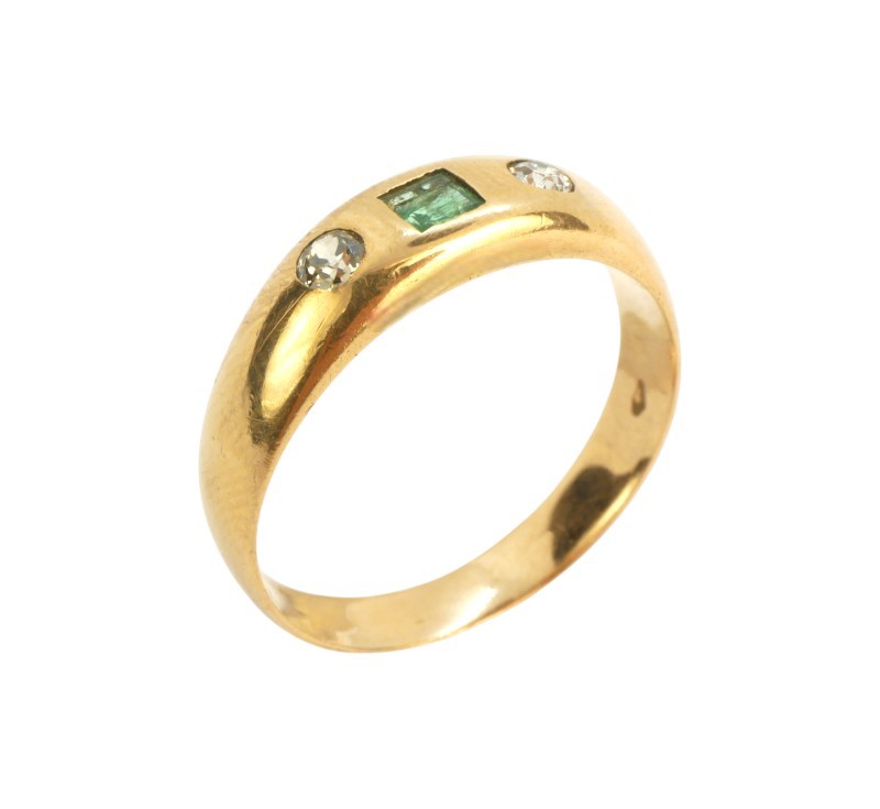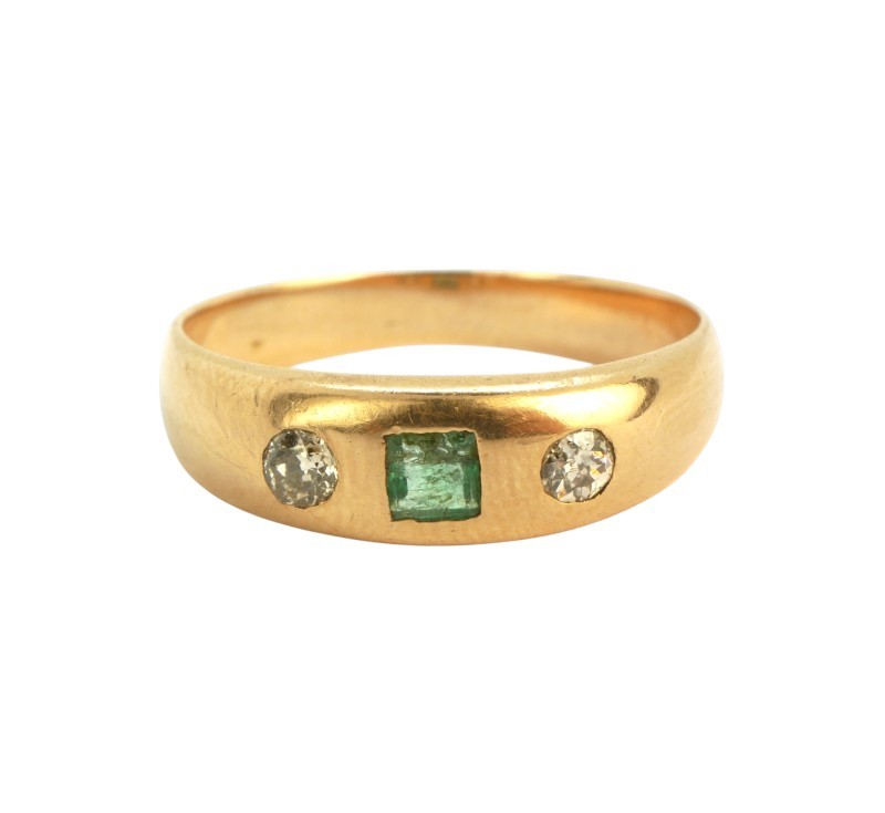 Starožitný zlatý prsten s přírodními diamanty briliantového brusu a smaragdem,