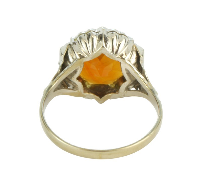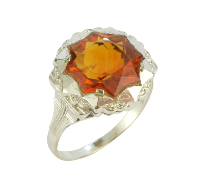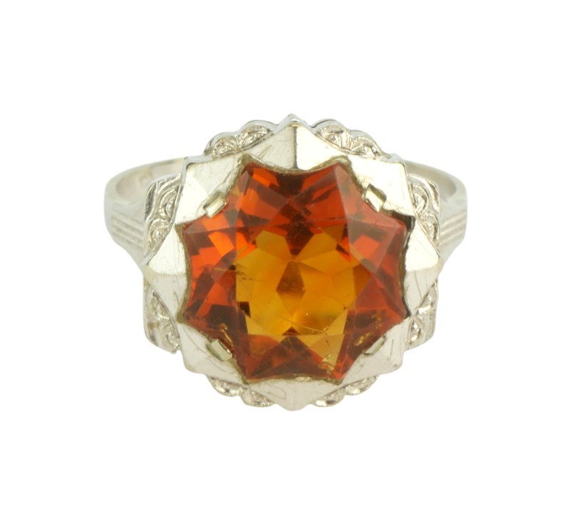 Velmi elegantní starožitný prsten z bílého zlata je osazený přírodním citrínem zářivé, hnědooranžové barvy o hmotnosti 4,3 ct,