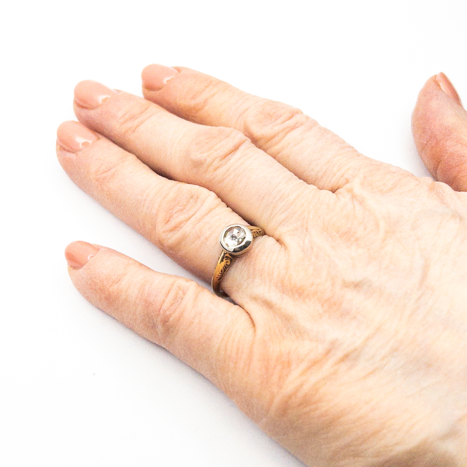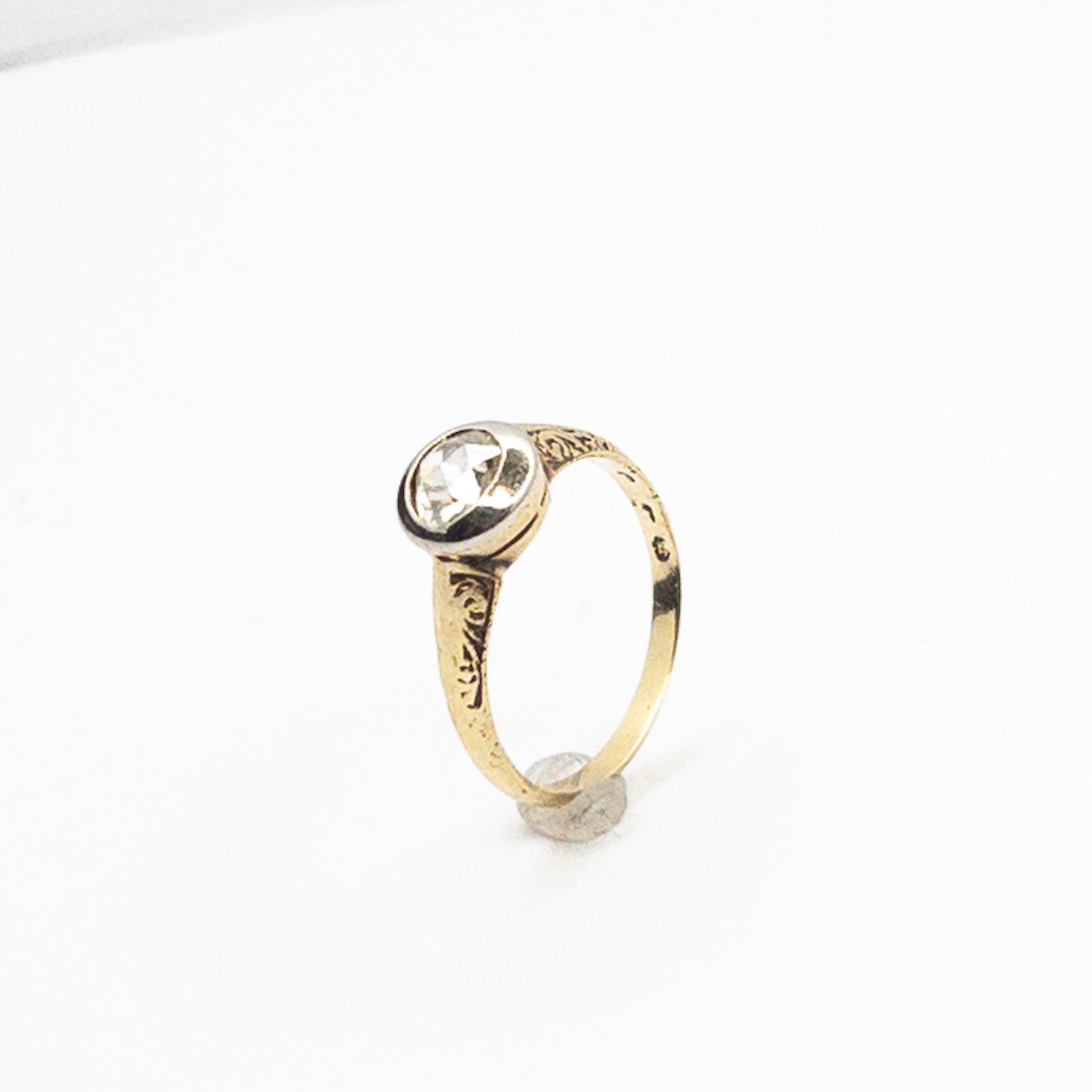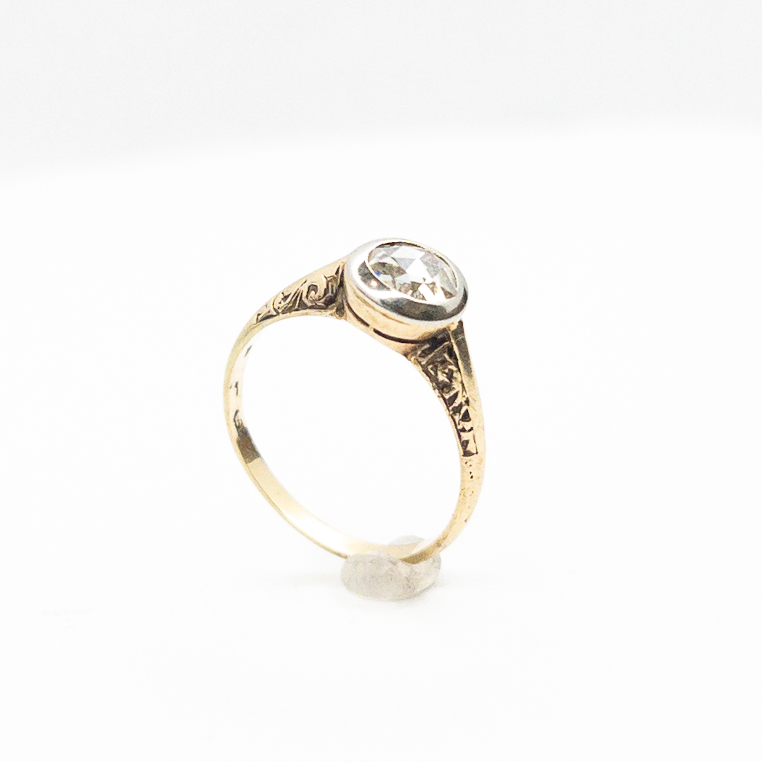 Prsten je osazený přírodním diamantem růžového brusu ( holandská routa ) o průměru 5,1 mm, hmotnost cca 0,35 ct.
