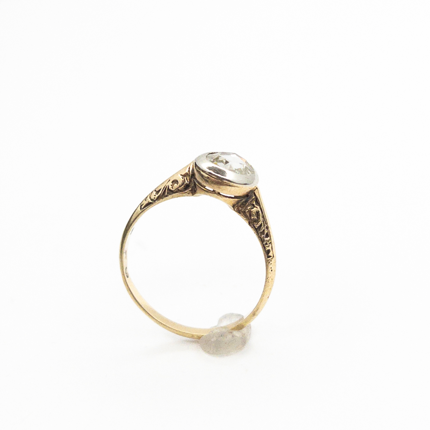 Šína prstenu je ze žlutého zlata a je zdobena gravírováním, typickým pro 20.-30. léta 20. století, tedy pro období Art Deco,