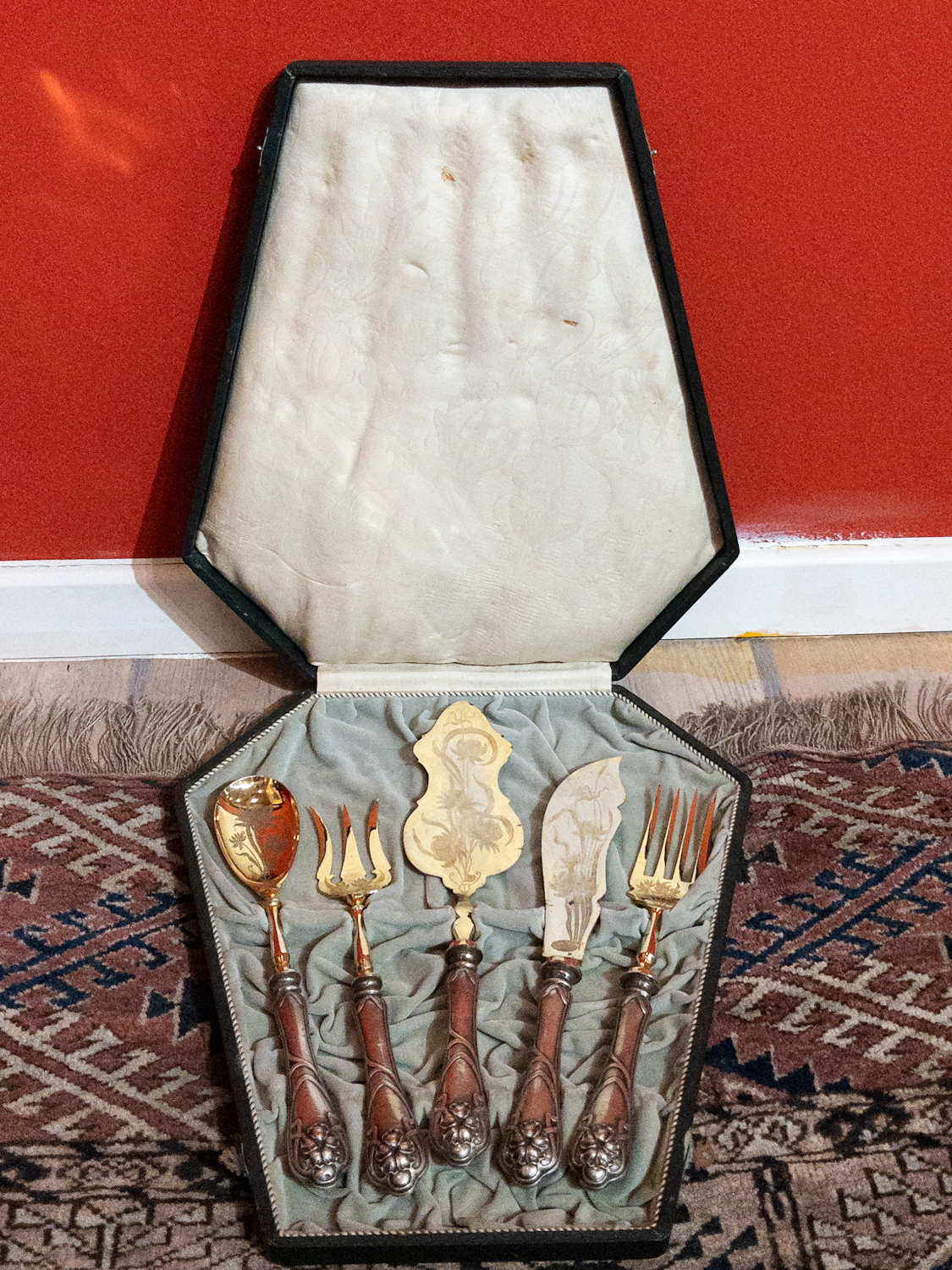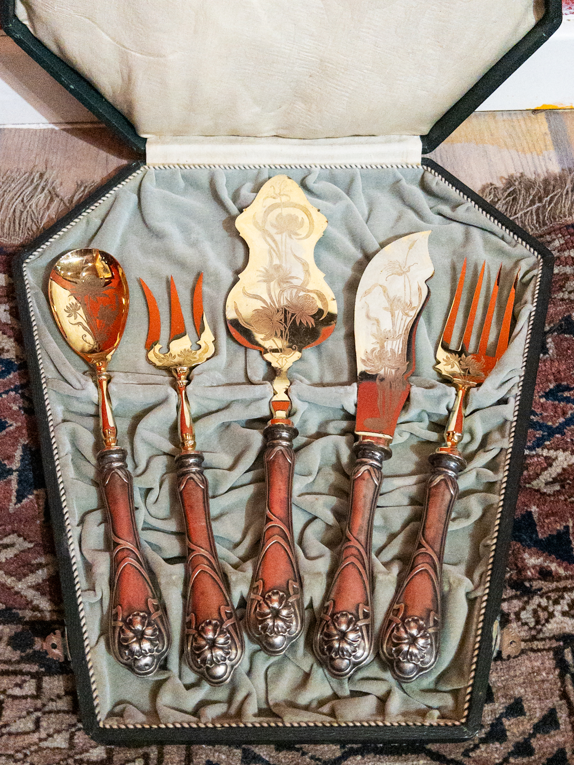 Starožitné, velmi dekorativní stříbrné předkládací příbory v kazetě,
