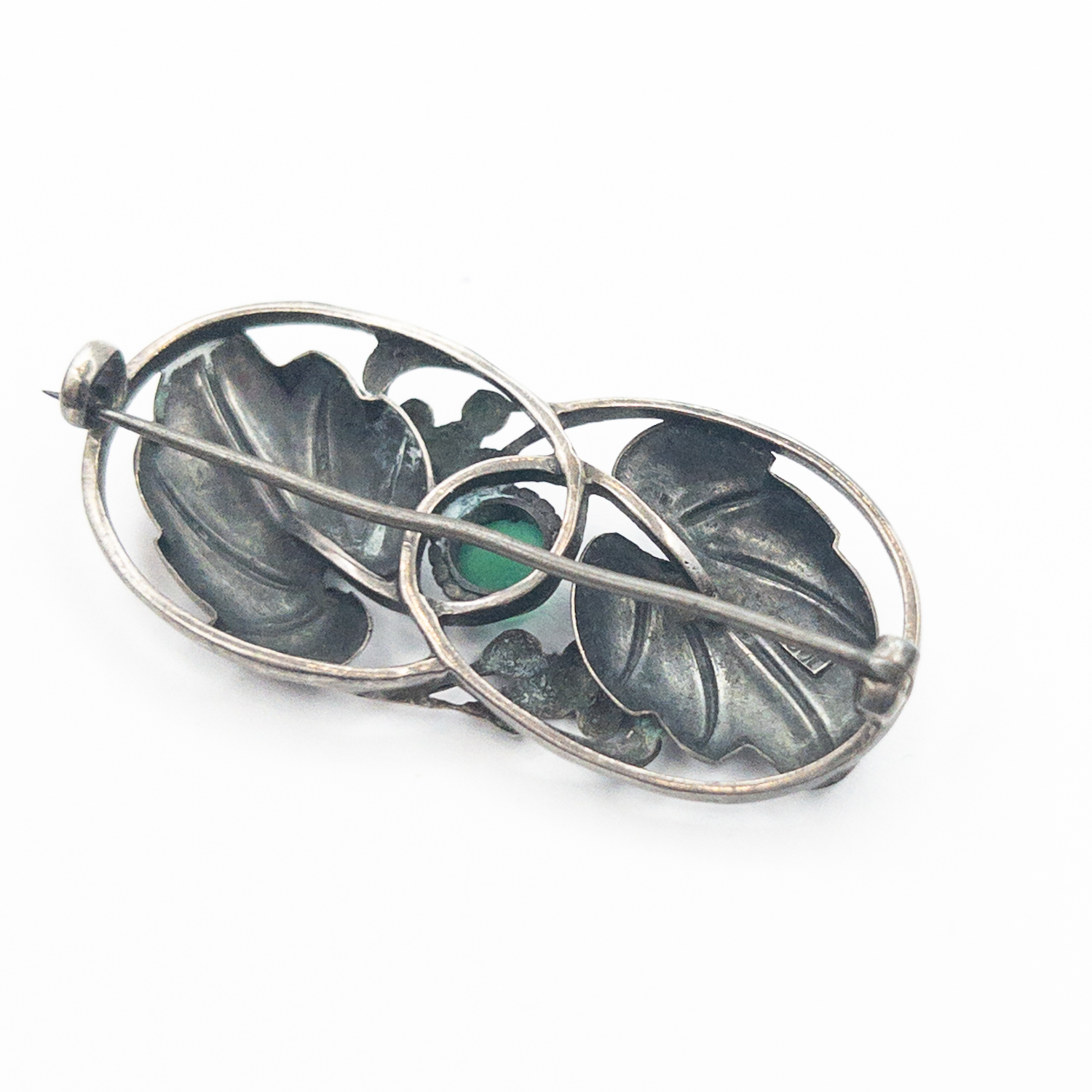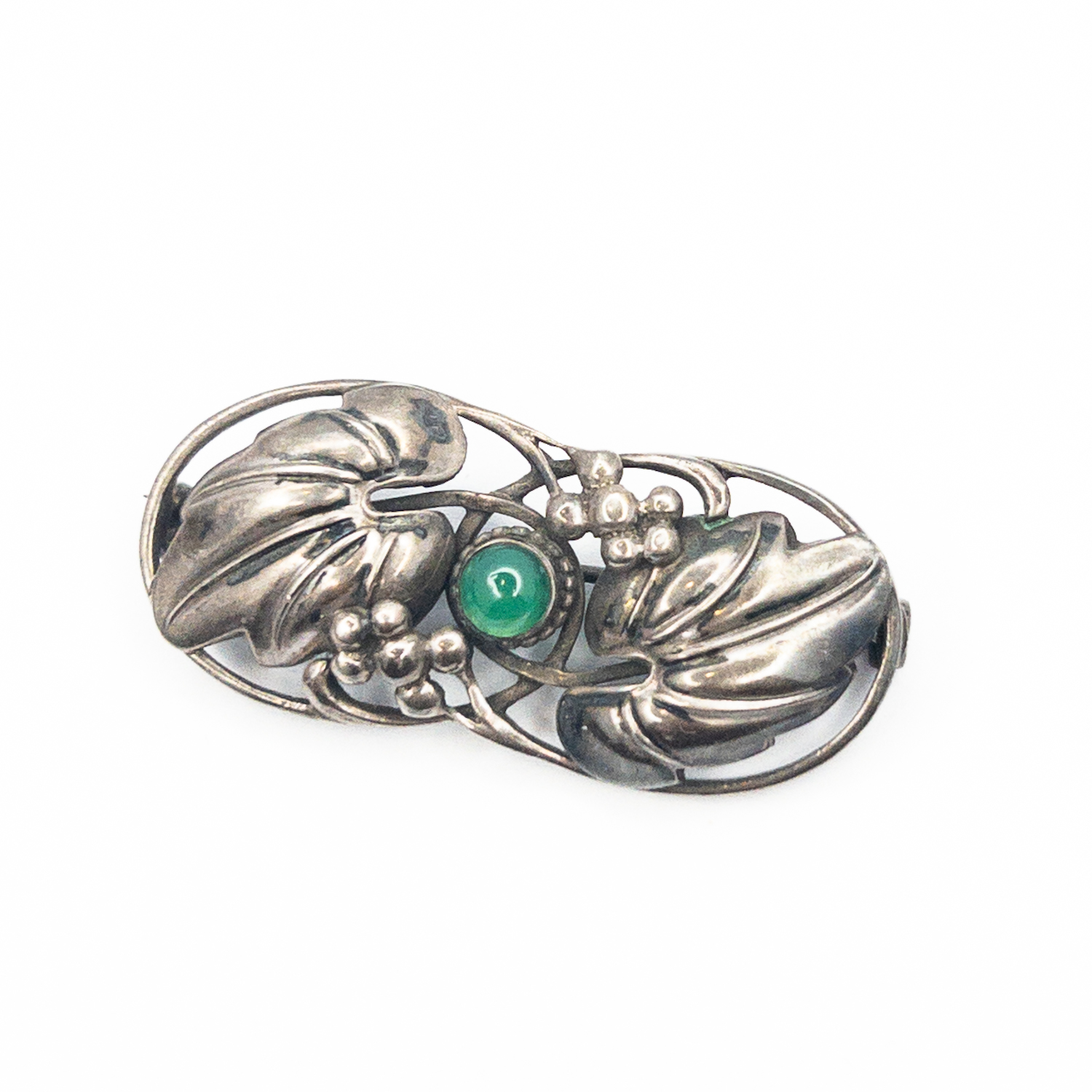 Zajímavá stříbrná brož s vinnými hrozny a listy a centrálním zeleným kamenem ,