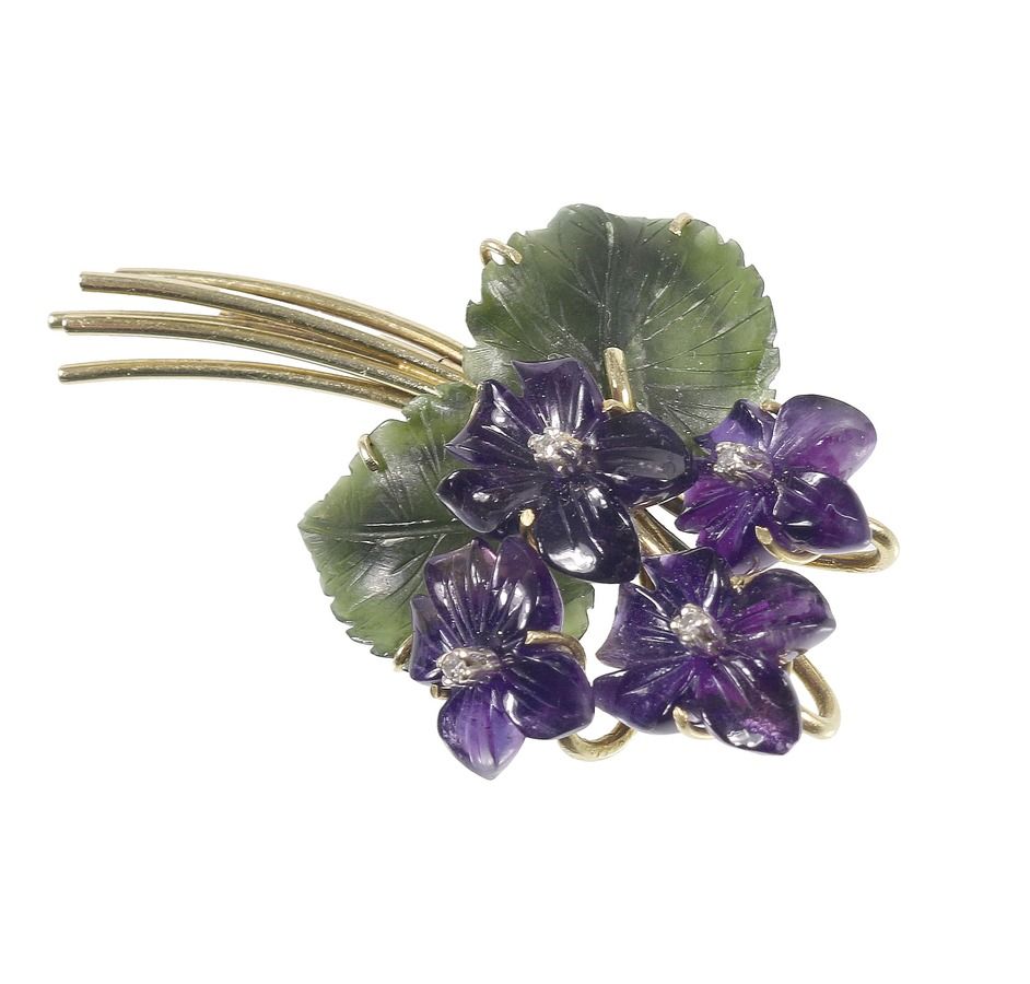 Zlatá brož s okvětními lístky z broušeného ametystu v nichž jsou zasazené bílé diamanty,
