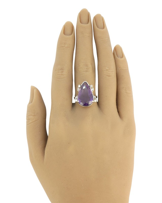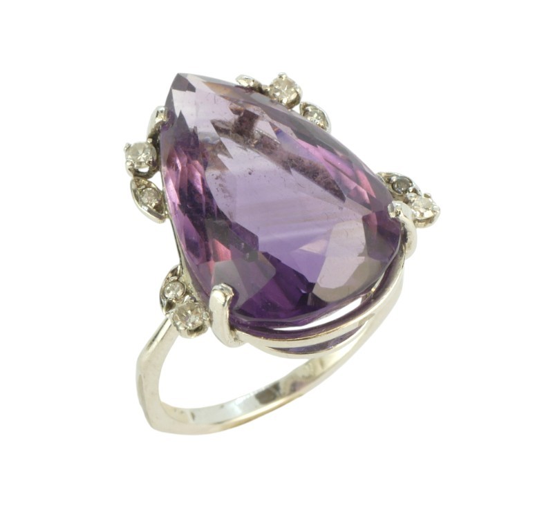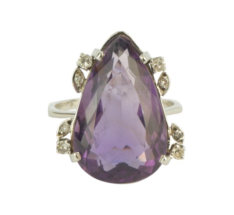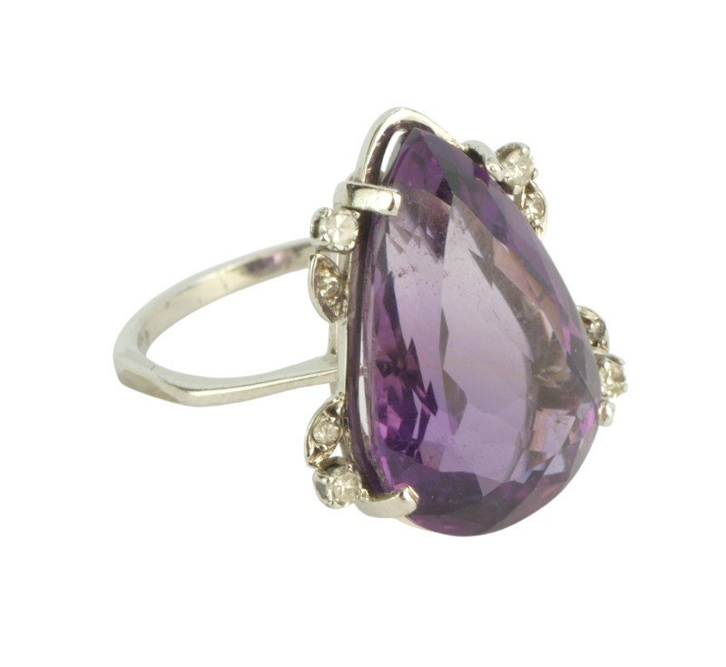 centrální kámen byl ověřen jako přírodní ametyst o váze 12 karátů, kapkového portugalského brusu